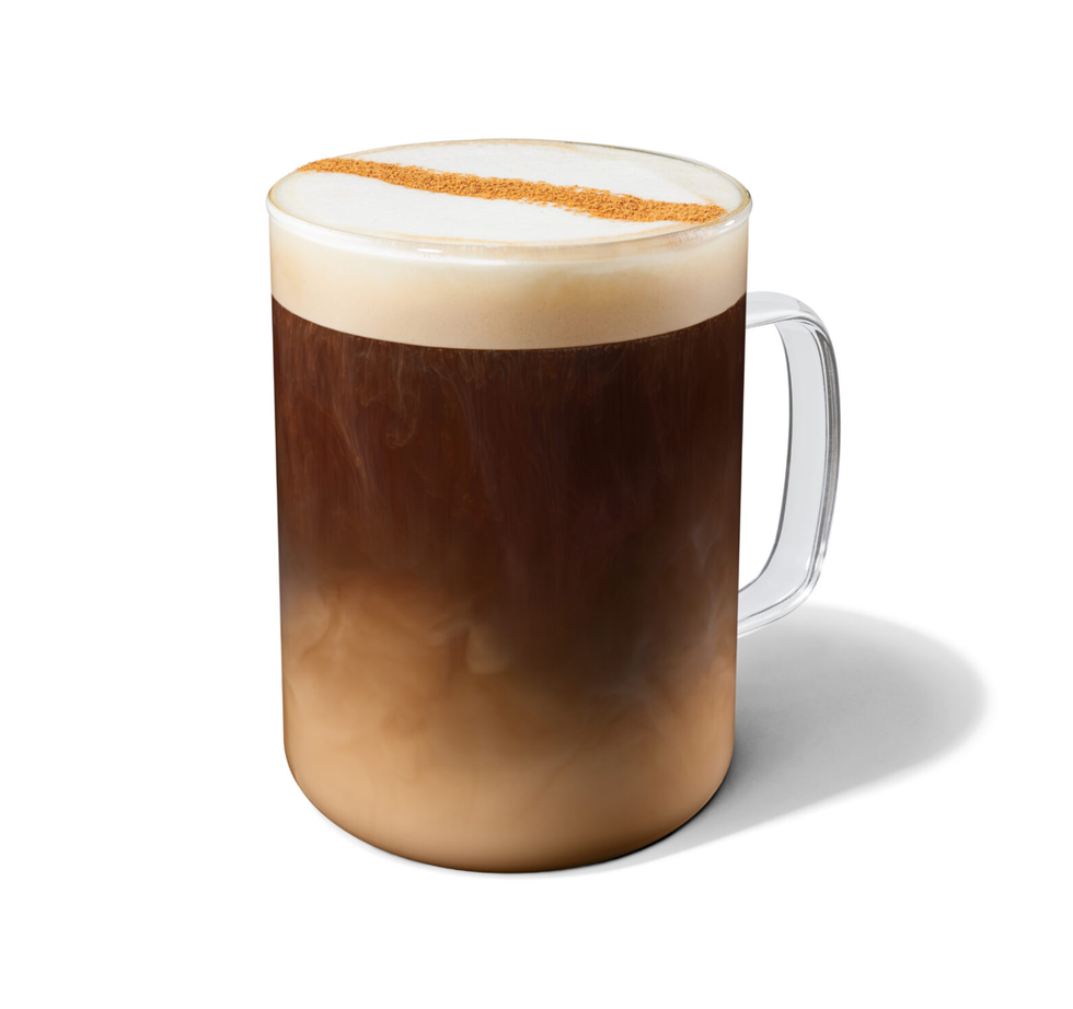 It’s made up of Starbucks Blonde® Espresso, brown sugar syrup and water, and is topped with steamed oat beverage and cinnamon.
