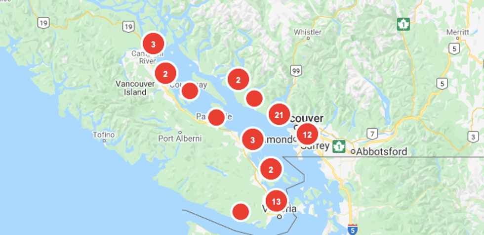 According to the BC Hydro outage map, there are outages across B.C., with the highest amount of customers affected in northern Vancouver Island.