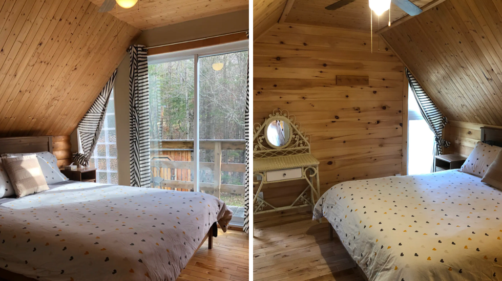Deux chambres tout en bois, dont une qui semble avoir une vue sur la forêt.