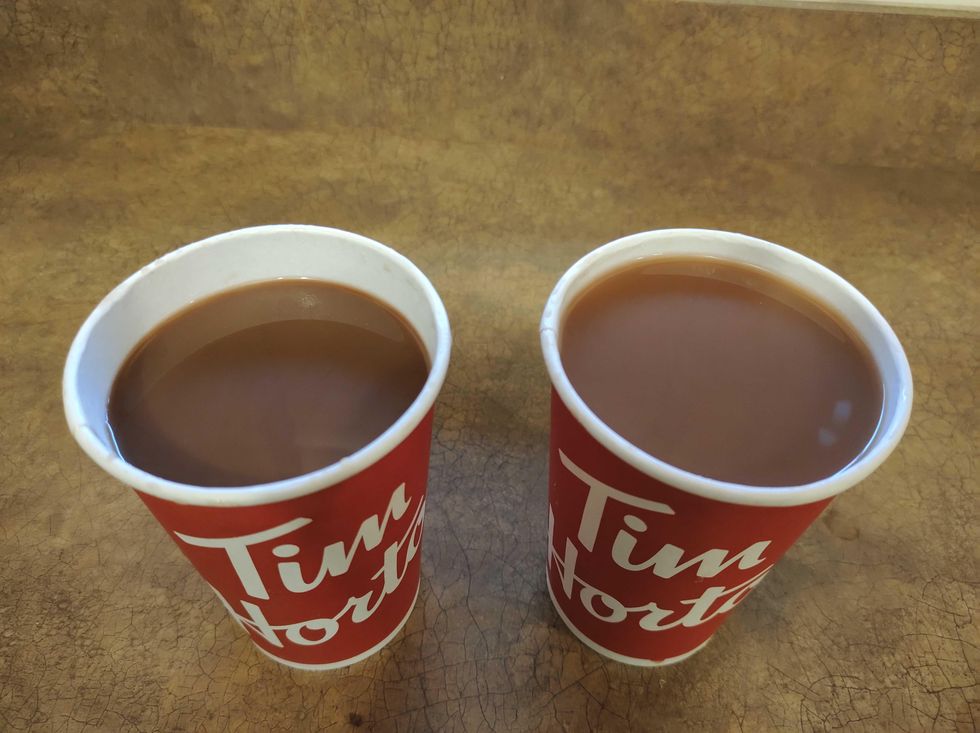 Le gobelet du Tim Hortons est le plus petit de toutes les adresses visitées, mais c'est aussi le moins cher. C'est probablement parce que le mélange ne contient pas de lait ; il est entre autres possible de le constater en raison de la couleur qui est plus foncée et la température du breuvage. Assure-toi d'attendre un bon moment avant de le boire pour éviter de te brûler la langue. (Oui, je me suis fait prendre au piège!)