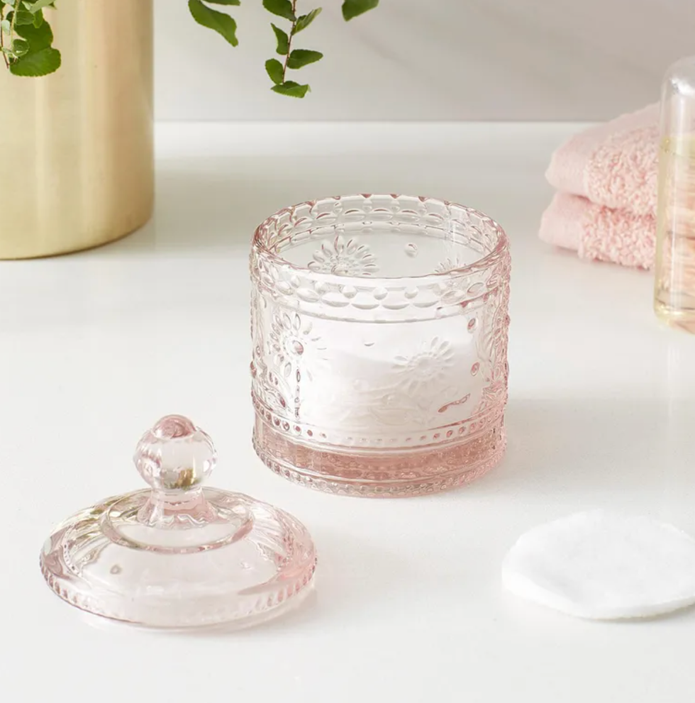 You can give your bathroom counter a mini upgrade by placing your loose baubles and tiny toiletries in this adorable glass jar. It'll work well for makeup remover pads or cotton balls, too.