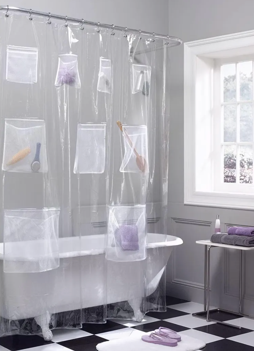 Believe it or not, this clear shower curtain comes equipped with mesh pockets! If you have minimal storage space in your bathroom, this nifty curtain will give you plenty of room to stash your toiletries.