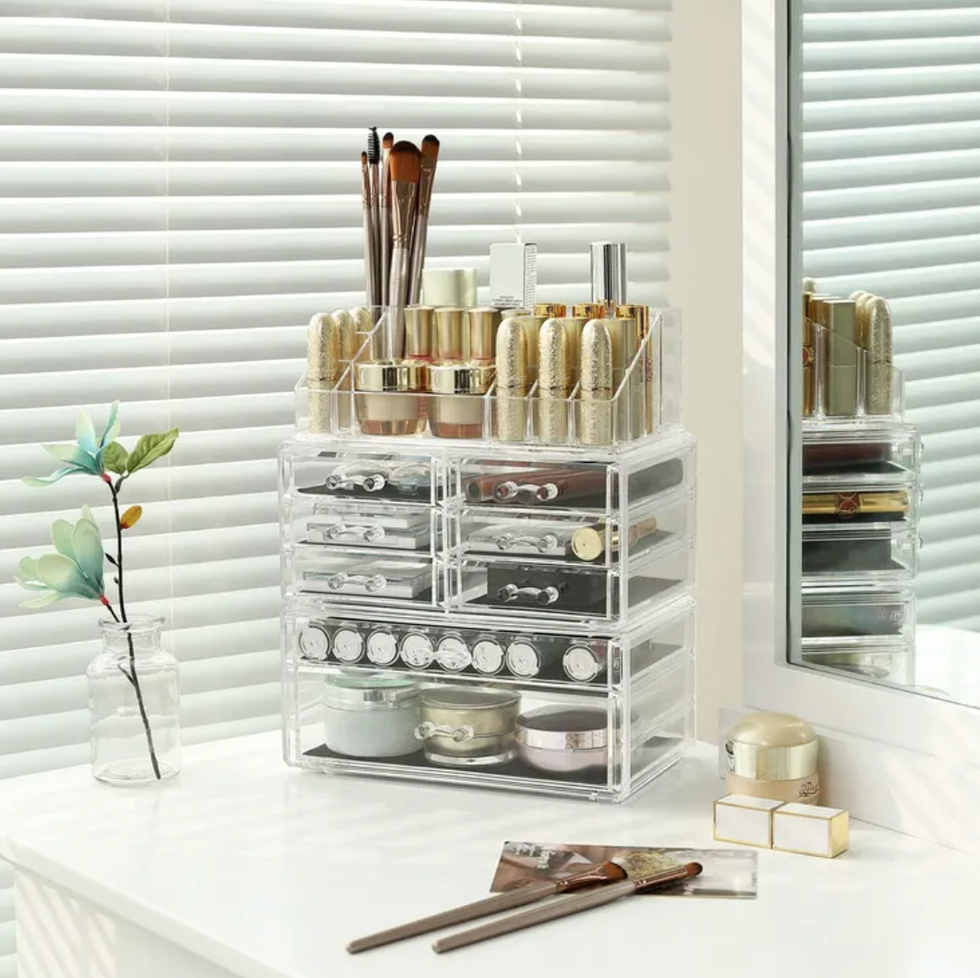Here's how to declutter your vanity and get your makeup and skincare under control. This acrylic organizer has a ton of compartments that'll help you finally get all of your beauty products organized.