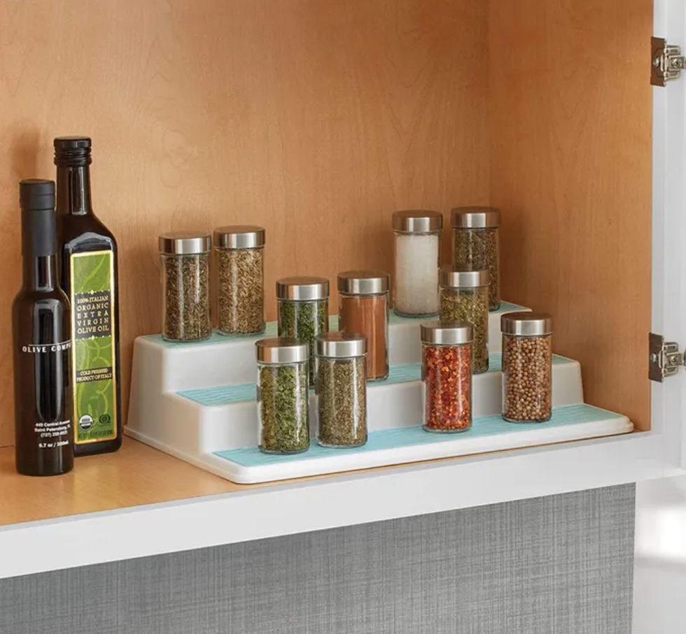 If you're an avid cook, consider investing in a tiered organizer so you can see all of your spice jars without shuffling them around.