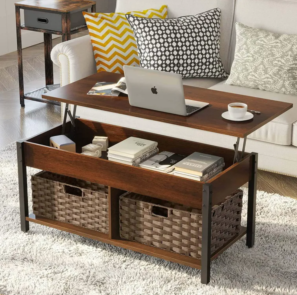This genius coffee table actually lifts up into a desk, so you can use your laptop comfortably while you WFH on your couch. It also has a ton of storage, including two slide-in baskets and a hidden section beneath the lift-out tabletop.