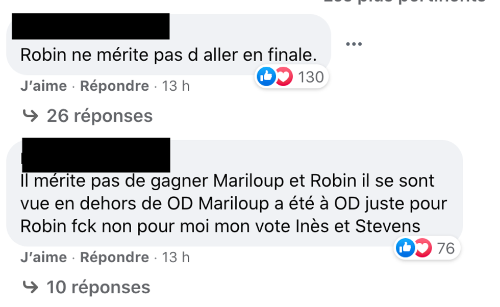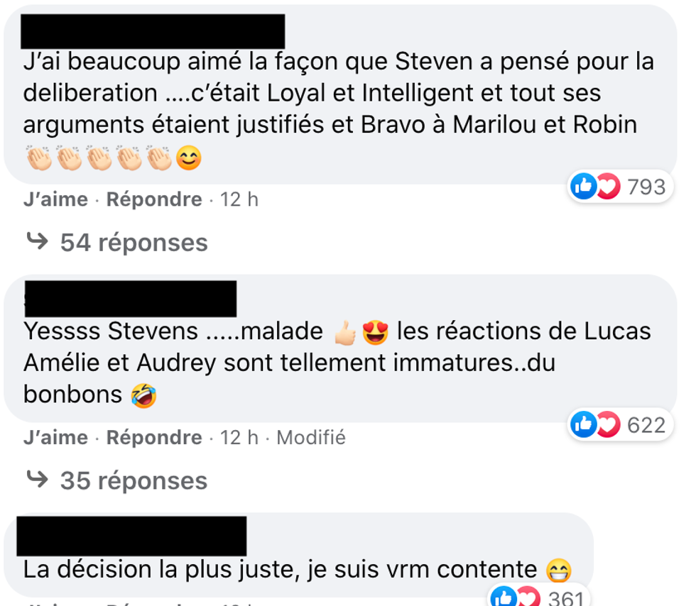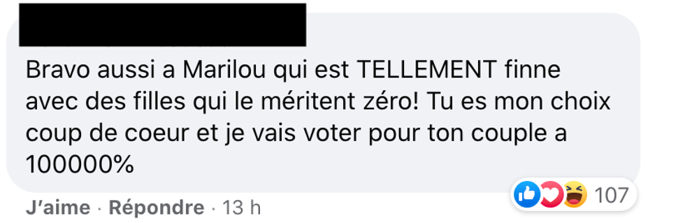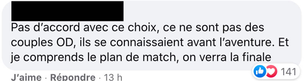 « Il y avait comme un clash avec ce que les autres candidats disaient de nous parce que depuis le départ les autres candidats disaient, avec raison, qu'on était un couple vrai et fort. Ça n'a pas été bien imagé à travers l'émission, mais on comprend qu'il y a eu beaucoup de drama, beaucoup de twists aussi, mais c'est sûr que c'est ça qui nous a surpris. »