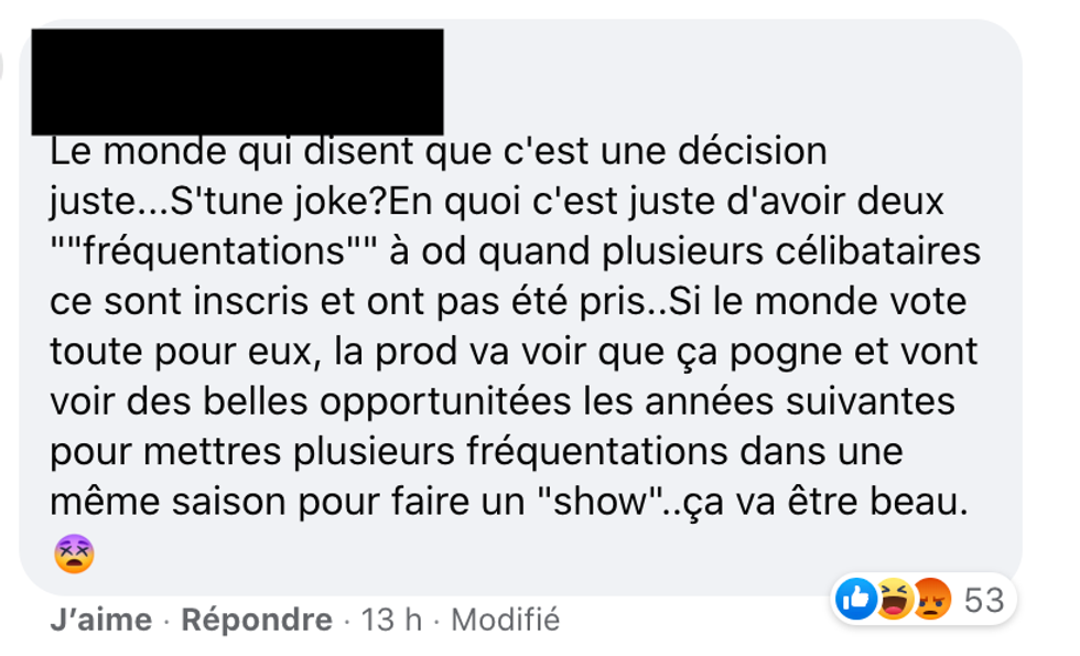 « Au dernier souper, j'ai fait un peu une déclaration d'amour à Luca », raconte Amélie. « J'attendais tellement de voir cet épisode-là, c'est la seule fois que j'ai pris mon courage puis que je me suis vraiment ouverte sur mes sentiments, puis ils ont rien mis de ça […]. C'est sûr je pense que c'est ça qui était un peu décevant, de s'attendre à voir des belles choses qui finalement n'ont pas été choisies ».