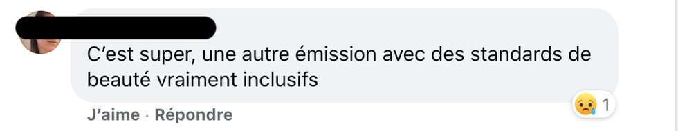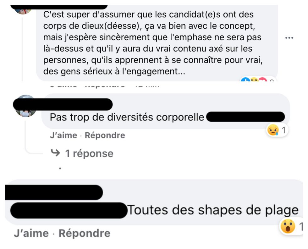 « Au niveau de l'équipe qui a sélectionné [les candidat.es], je pense qu'il montre au public ce qu'il veut voir. Il n'y a personne qui va faire une téléréalité avec les gens que personne veut voir. Ce qu'on veut voir, ce sont des corps X dans le standard avec peut-être une personne qui diffère.