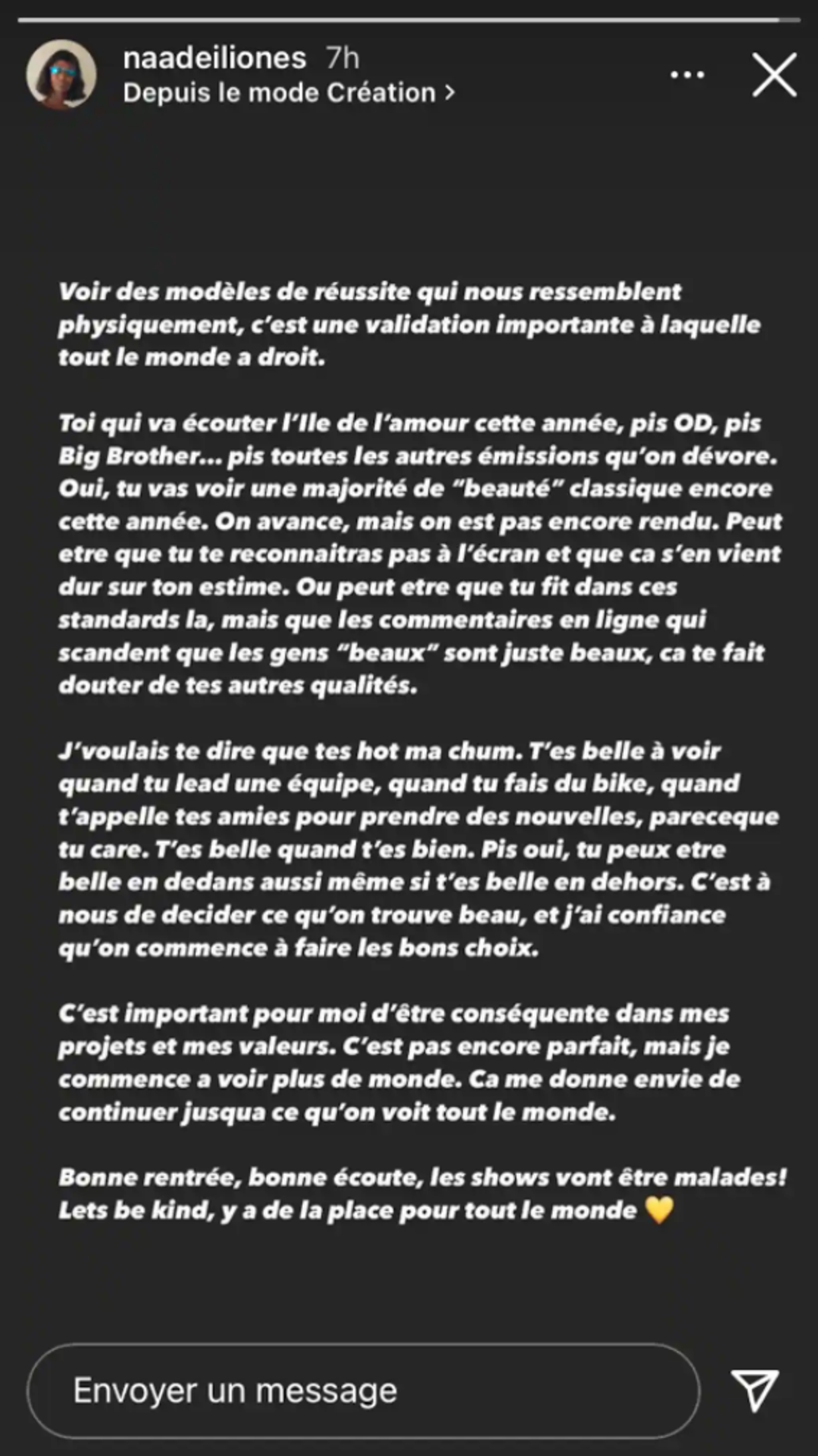 « J'ai envie de dire de juste les inclure au même titre que les autres, mais en dehors de ça, on a encore des trucs comme L'île de l'amour par exemple, que la diversité corporelle est sur une autre planète.