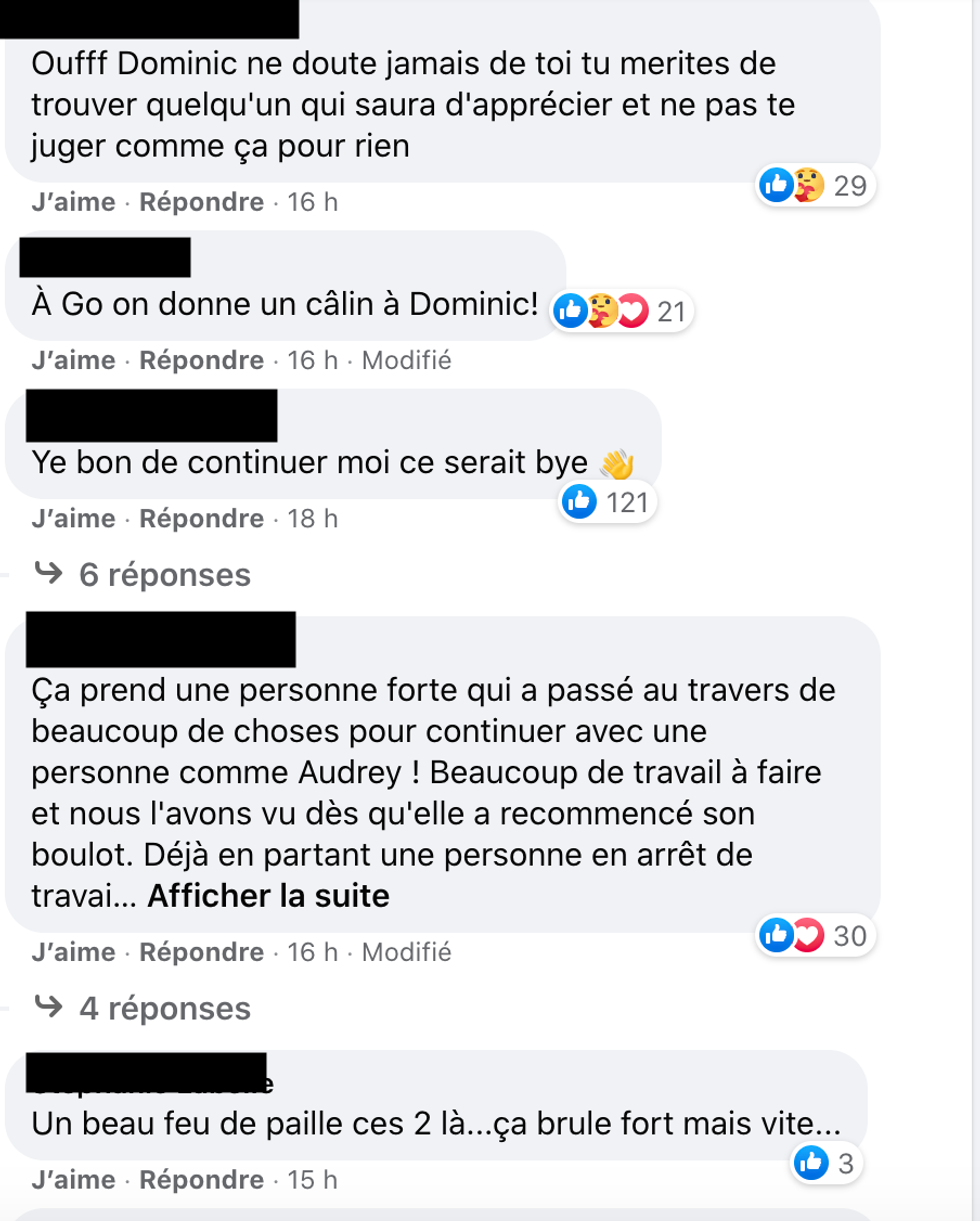 Alors que ça faisait déjà plusieurs épisodes que la relation entre Dominic et Audrey battait de l'aile à Si on s'aimait, au début de la huitième semaine de l'émission, le duo a décidé de continuer l'aventure en tant qu'amis seulement. Cela dit, le public a appris ce 4 novembre que l'homme de 33 ans a décidé de « tirer la plug », comme dirait Émily Bégin.