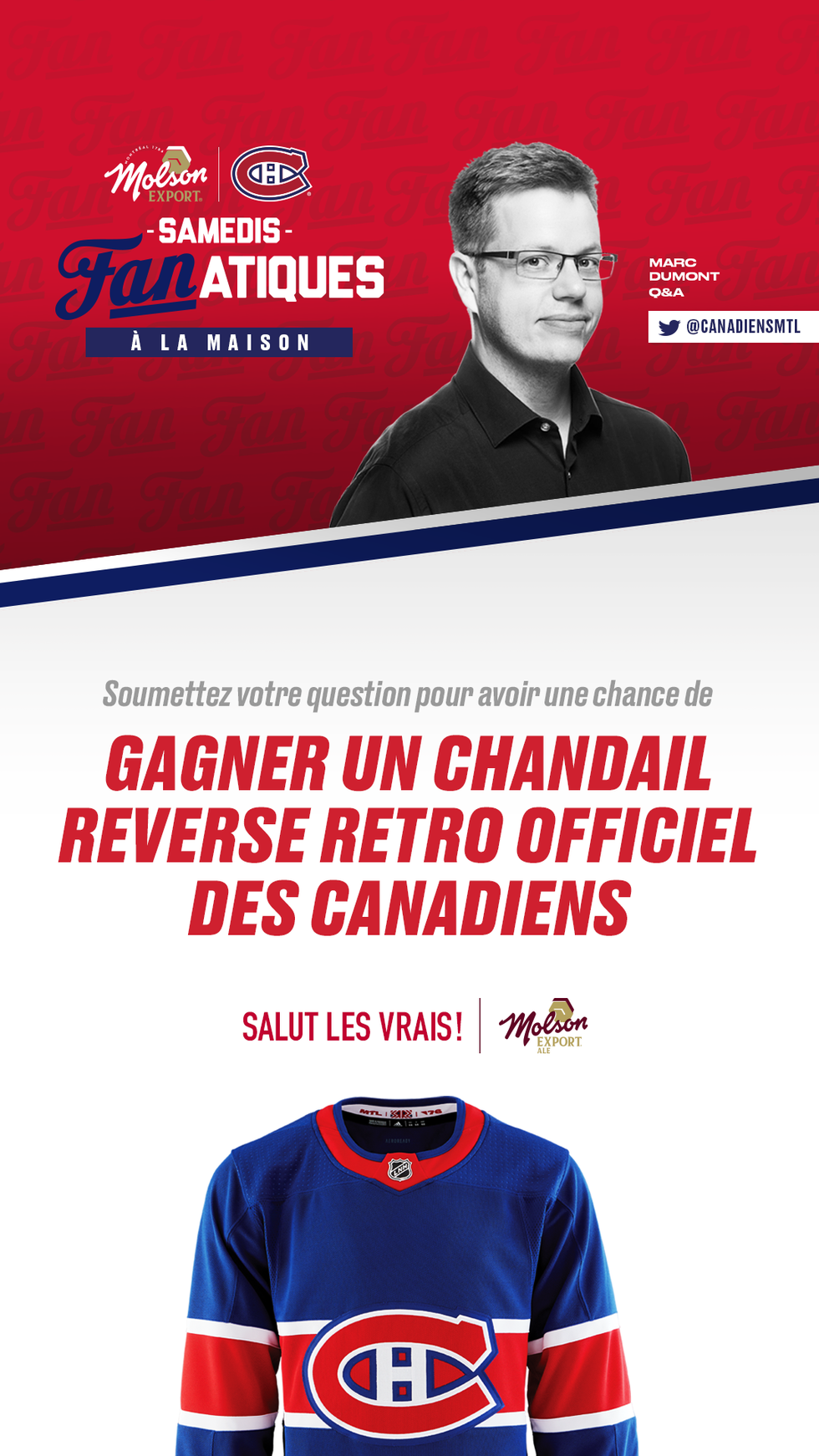Pour participer, les fans devront soumettre une question pour la session de questions-réponses via Facebook ou Twitter. Le partisan dont la question sera sélectionnée et à laquelle Marc répondra durant le Q&R sera déclaré « Le Vrai Fan » et recevra un chandail Reverse Retro.