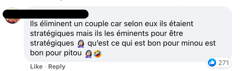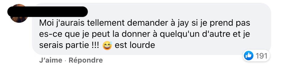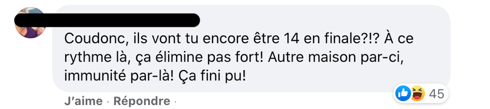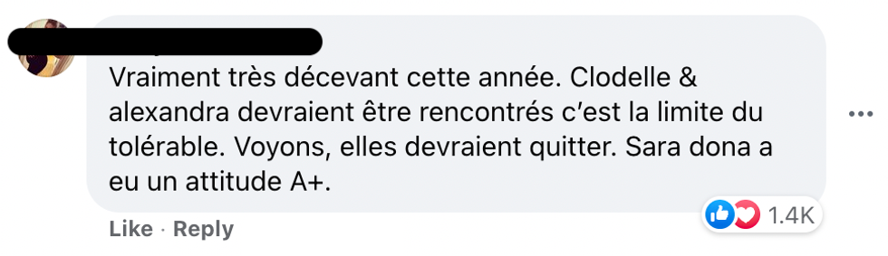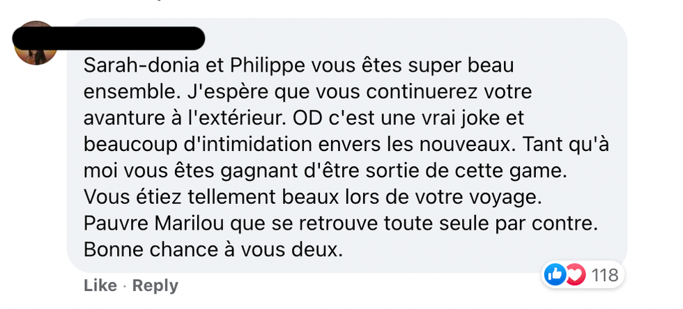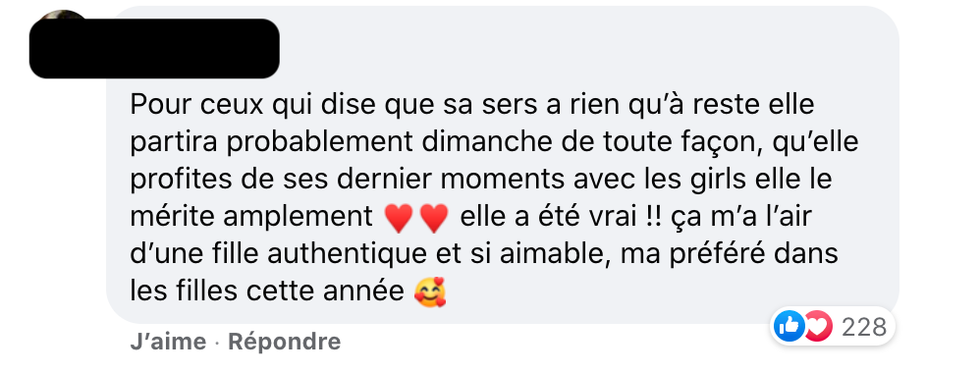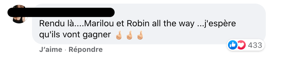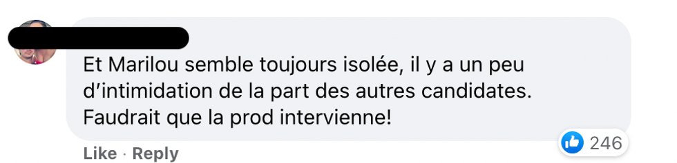 « Pour de vrai, on s'est super bien entendues. La seule petite chose que j'ai pas tant aimée c'est que j'ai perçu qu'elle a été malhonnête avec moi, dans le sens où elle disait qu'elle ne venait pas pour Robin, mais en fait elle est venue pour Robin. Dans la vie de tous les jours, moi puis Marilou, on serait vraiment amies. »