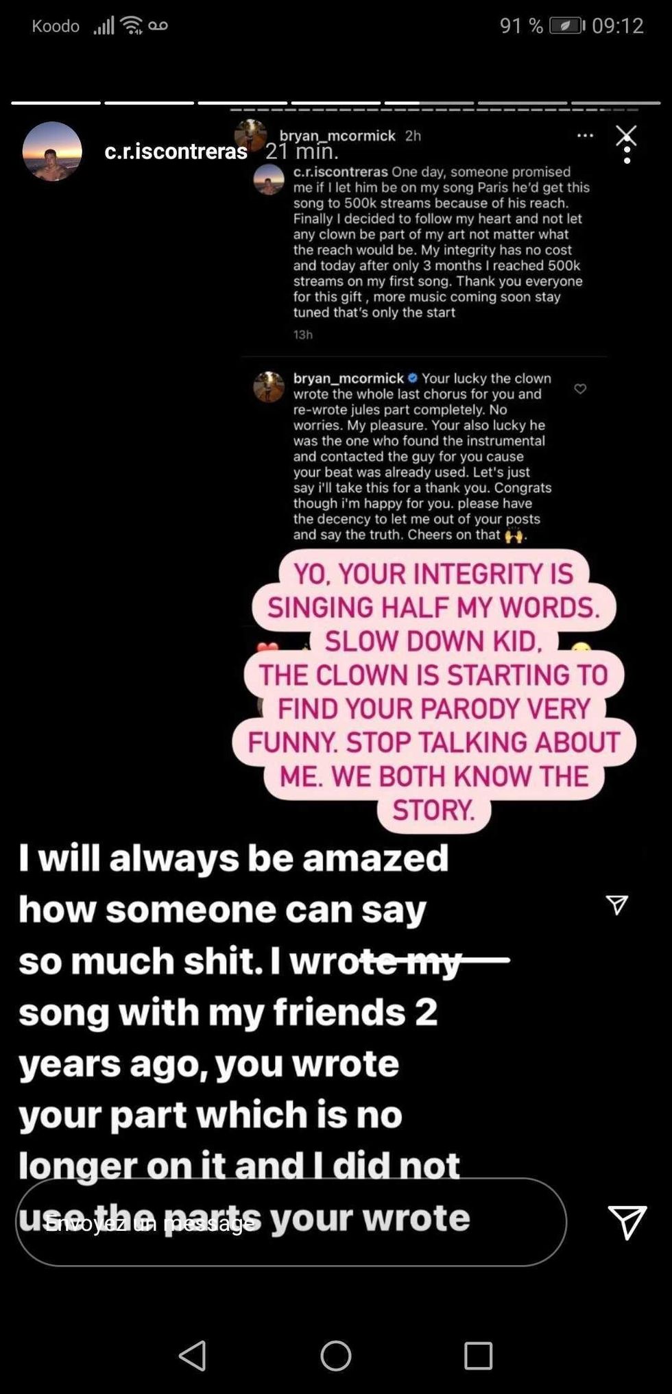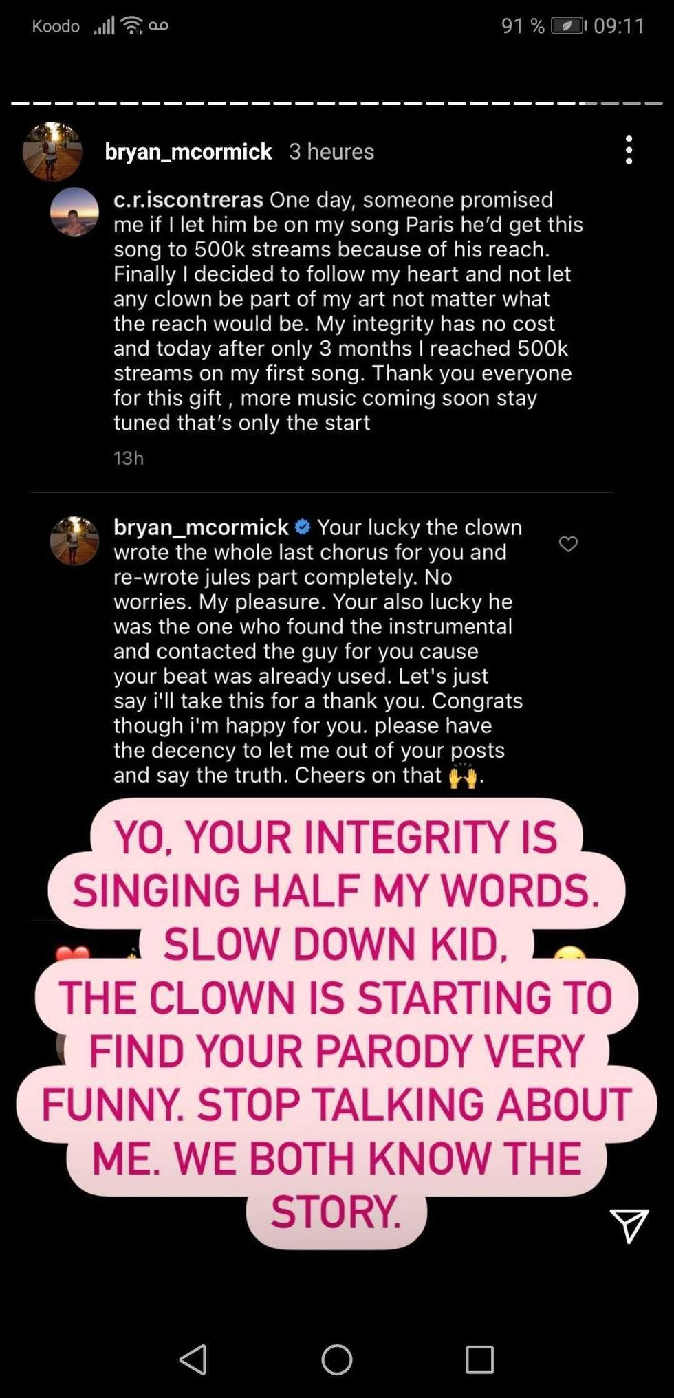 Il a également ajouté : « Ton intégrité c'est de chanter la moitié de mes mots. Doucement le jeune. Le clown commence à trouver ta parodie vraiment drôle. Arrête de parler de moi. On connaît tous les deux l'histoire. »