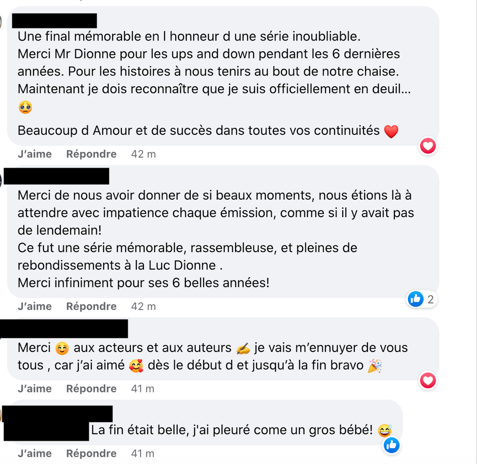 L'acteur qui a campé le rôle de Patrick Bissonnette depuis le tout premier épisode poursuit en remerciant le public : « Sans vous, rien de tout cela n’aurait été possible. Vous avez été pour moi un partenaire de jeu extrêmement présent et nécessaire. Nous nous retrouverons peut-être dans un futur rapproché, mais je pense que jamais je ne connaîtrai une relation aussi intense et enivrante. D’ici là, je vous invite à continuer d’encourager et de soutenir notre télévision avec enthousiasme et rigueur. »