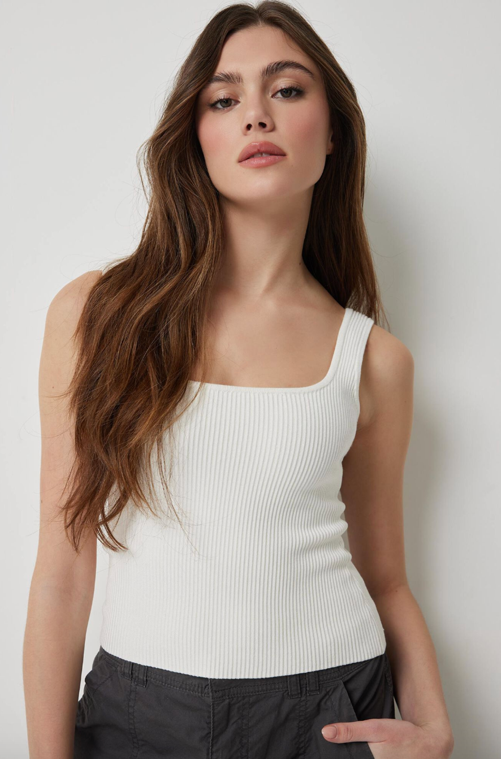 The Ardene Shape Knit Tank features a cropped length, square neck and fitted cut, and is a perfect dupe for Aritzia's Sculpt Knit Squareneck Tank.