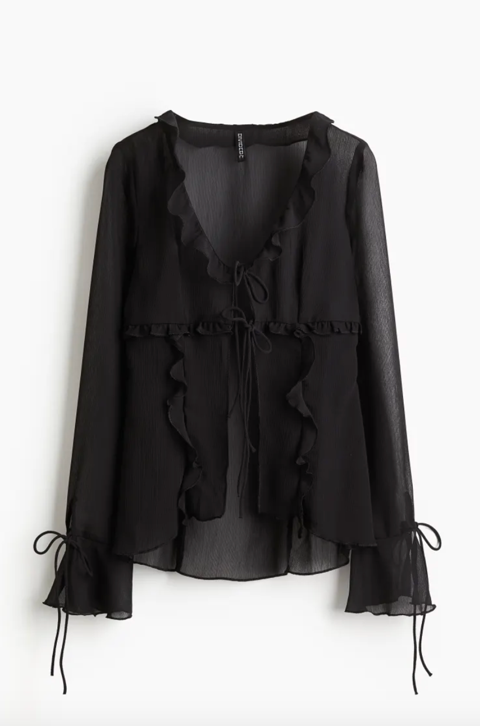 H&M's Chiffon Blouse is a fitted blouse made with sheer, crinkled chiffon. Like the Aritzia blouse, it features a V-neck with a ruffle trim, wide cuffs, and a tie-front closure. It comes in both black and white.