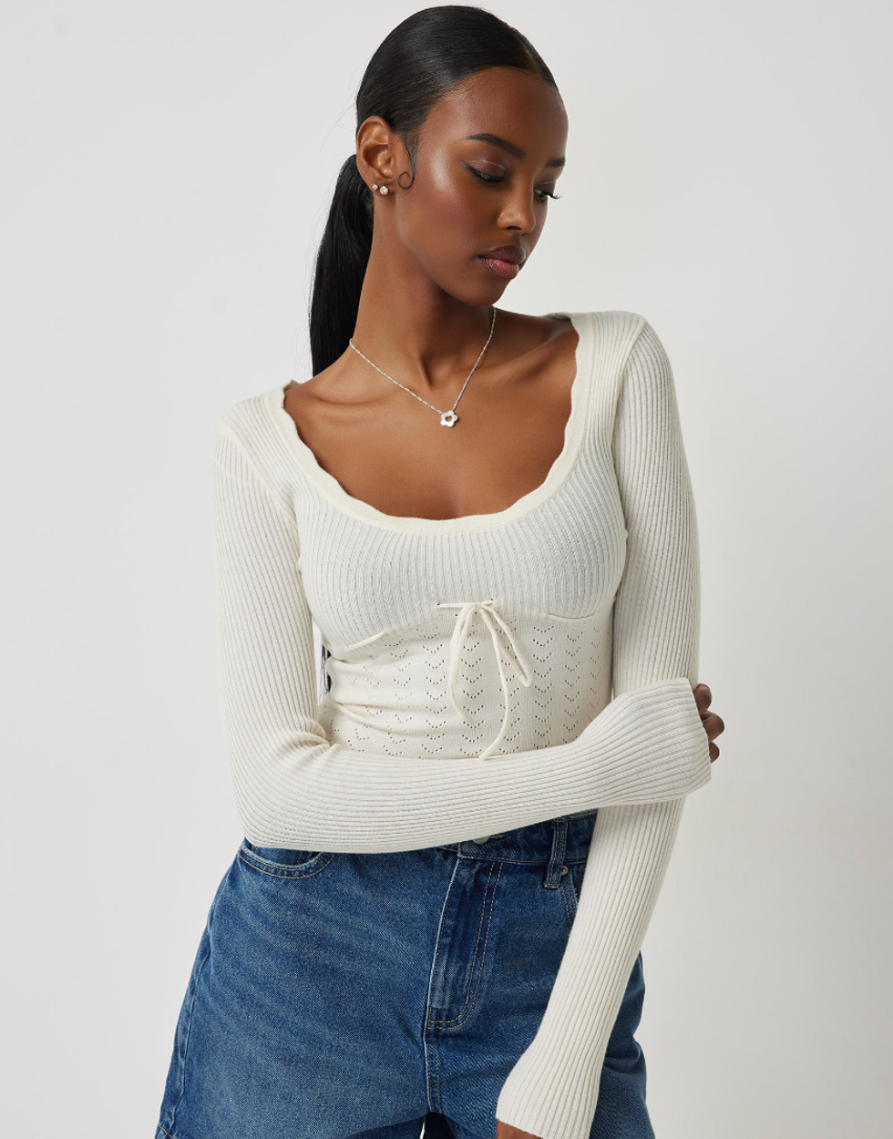Both tops feature a slightly scalloped neckline, a pointelle design, and a bow detail at the bust.