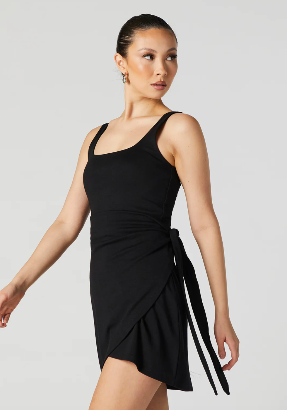 The dress is super similar to Aritzia's Saturn Mini Dress, featuring the same wrap style with side tie, square neckline and thick straps.