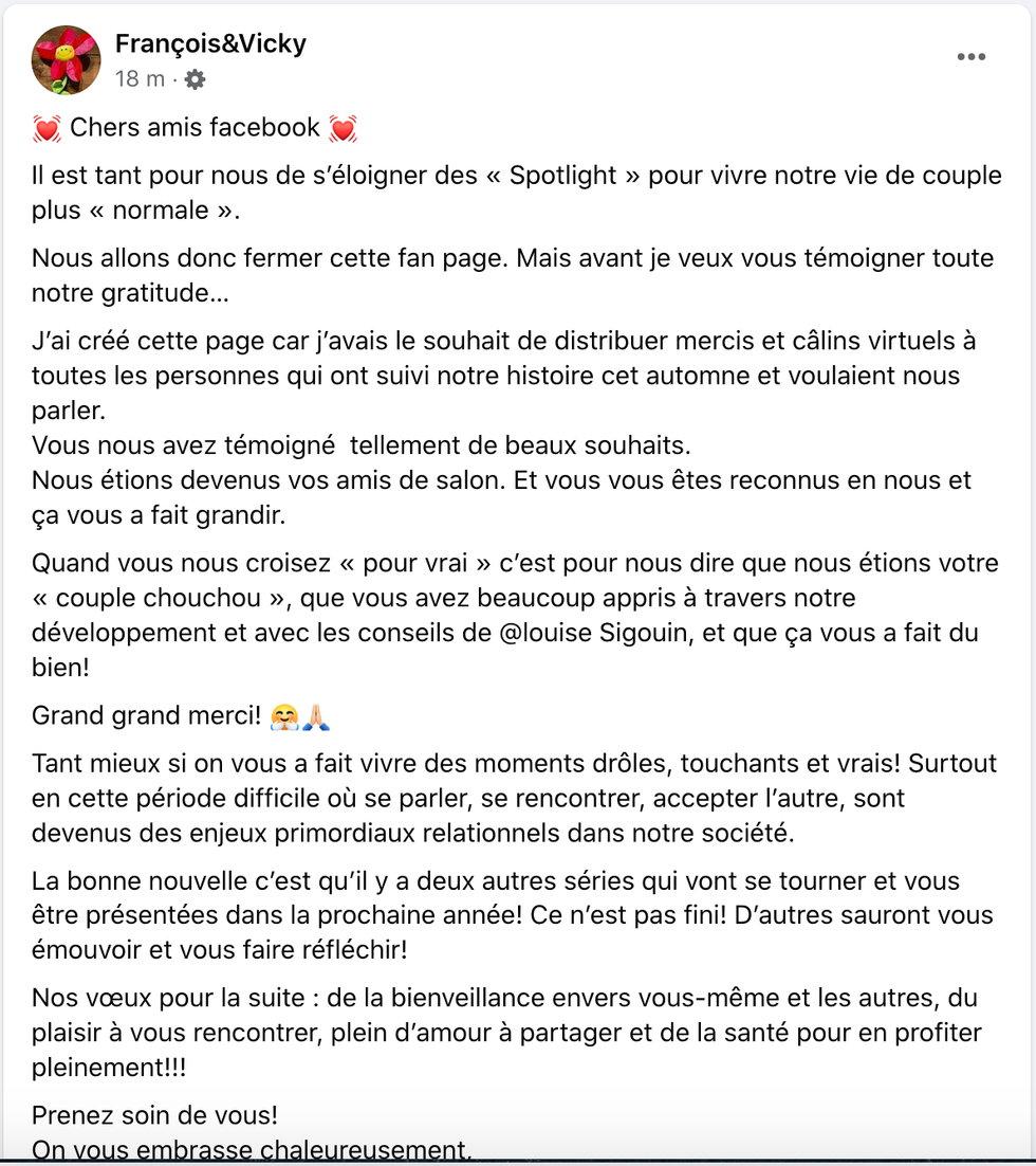 « Il est [temps] pour nous de s'éloigner des '' Spotlight'' pour vivre notre vie de couple plus ''normale''. Nous allons donc fermer cette fan page. Mais avant je veux vous témoigner toute notre gratitude... », peut-on lire en début d'un long message adressé aux téléspectateur.trices.