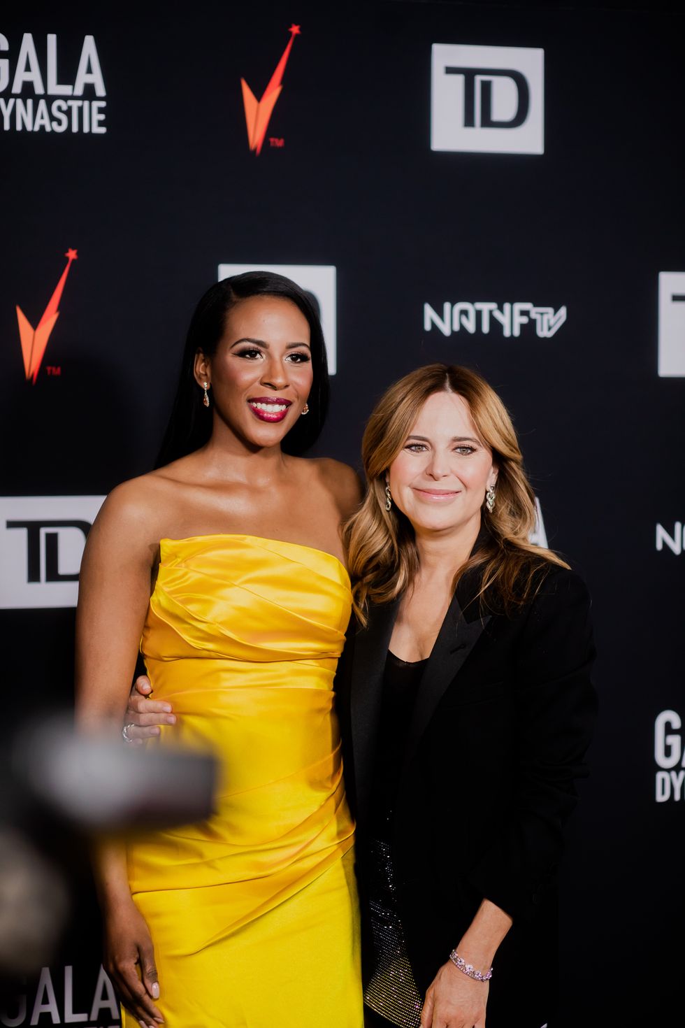 L'animatrice Djody Jean-Claude avait opté pour une robe jaune en satin et Julie Snyder portait un veston noir accompagné d'une jupe à paillettes.