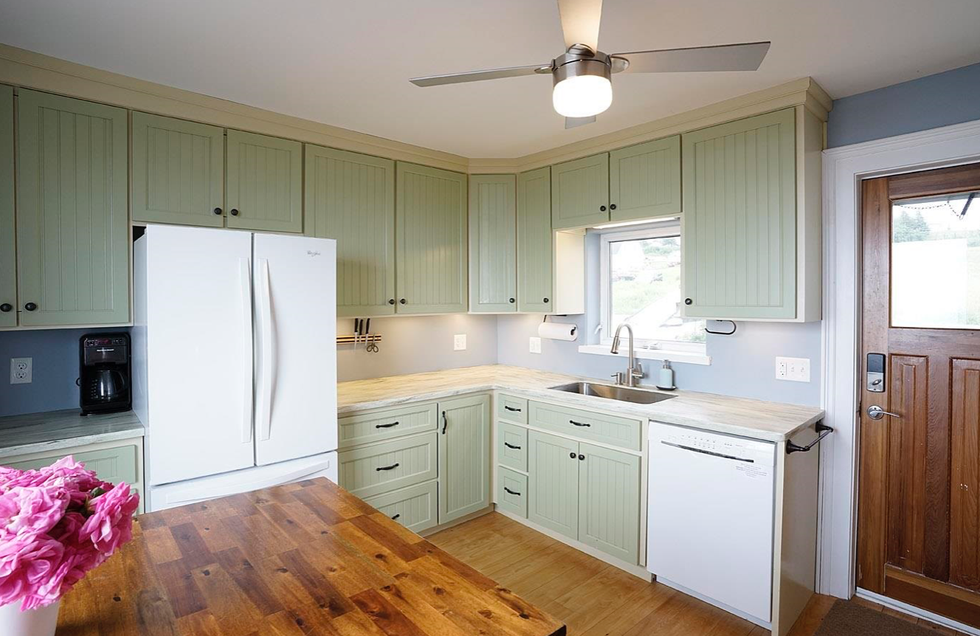 This house for sale in Nova Scotia is located down a winding laneway under a canopy of tall trees.