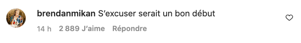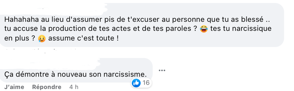 « Au lieu d'assumer pis de t'excuser aux personne que tu as blessé... tu accuses la production de tes actes et de tes paroles? T'es-tu narcissique en plus? Assume c'est toute! », argue cet.te internaute.