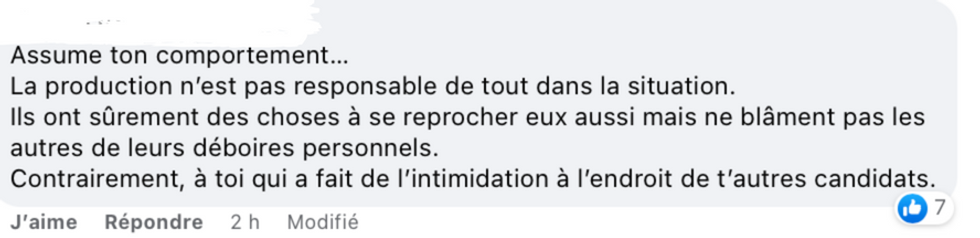 « Assume ton comportement... La production n'est pas responsable de tout dans la situation. Ils ont sûrement des choses à se reprocher eux aussi, mais ne blâment pas les autres de leurs déboires personnels. Contrairement, à toi qui a fait de l'intimidation à l'endroit d'autres candidats », explique ce.tte téléspectateur.trice.