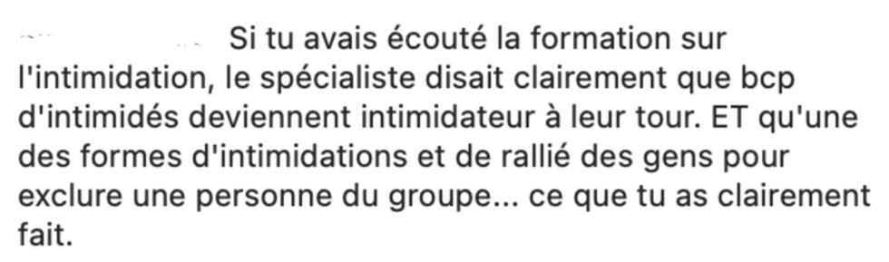 « Si tu avais écouté la formation sur l'intimidation, le spécialiste disait clairement que beaucoup d'intimidés deviennent intimidateurs à leur tour et qu'une des formes d'intimidations est de rallier des gens pour exclure une personne du groupe... ce que tu as clairement fait. »