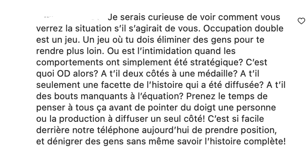 « Je serai curieuse de voir comment vous verrez la situation s'il s'agirait de vous. Occupation Double est un jeu. Un jeu où tu dois éliminer des gens pour te rendre plus loin. Où est l'intimidation quand les comportements ont simplement été stratégiques? C'est quoi OD alors? A-t-il deux côtés à une médaille? A-t-il seulement une facette de l'histoire qui a été diffusée? A-t-il des bouts manquants à l'équation? Prenez le temps de penser à tout ça avant de pointer du doigt une personne ou la production à diffuser un seul côté! C'est si facile derrière notre téléphone aujourd'hui de prendre position et dénigrer des gens sans même savoir l'histoire complète », a défendu cette personne.