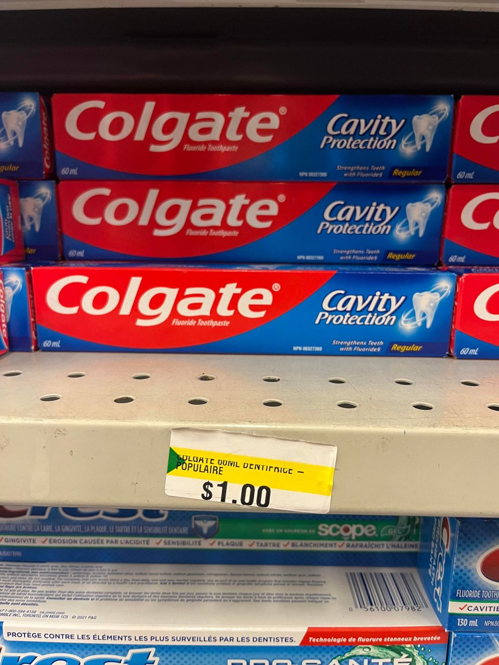 Le dentifrice Colgate pour enfants avec un personnage de Minion revient 0,54 $ moins cher au Dollarama. À noter qu’à la Pharmacie Jean Coutu, la version avec un Pokémon coûte encore plus chère, alors qu’au magasin du dollar, le prix reste identique peu importe le personnage sur le tube.