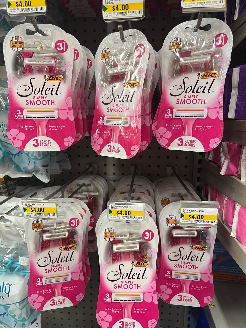 Pour ces emballages de quatre rasoirs jetables à trois lames BIC Soleil 3, Dollarama propose la version parfumée à la lavande ainsi que la version Smoother Shave, à 3,29 $ de moins que chez Jean Coutu, où l’on retrouve les versions Smoother Shave et peau sensible.