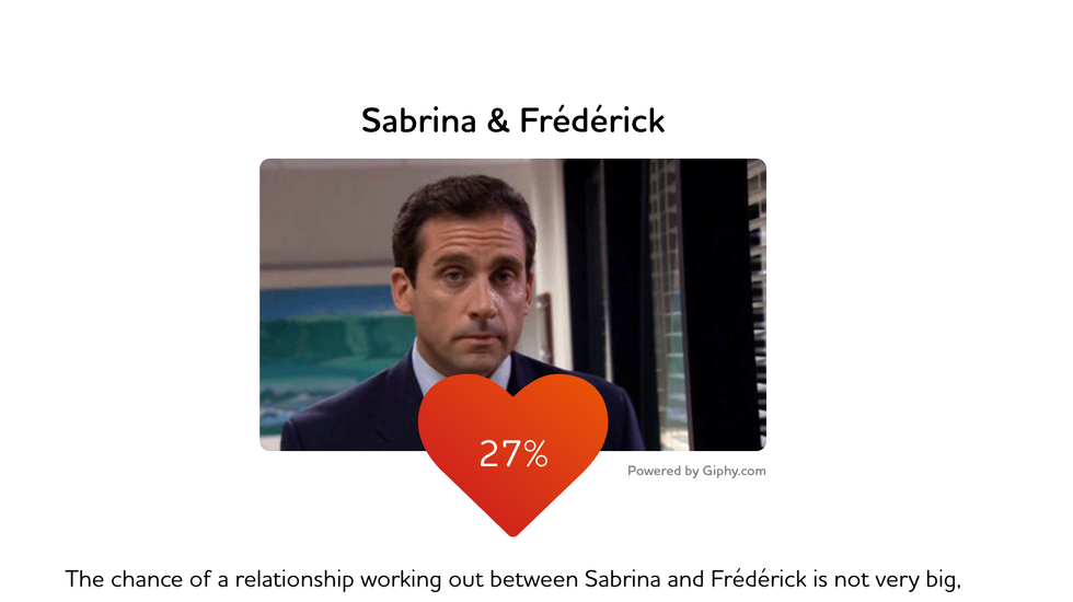 Cependant, on peut déjà oublier ça pour un potentiel amoureux à l'écart des caméras puisque l'étudiant en génie mécanique et la candidate ne sont compatibles qu'à 2 %. Bon, ce ne sont peut-être pas les probabilités exactes, mais c'est un résultat plausible.