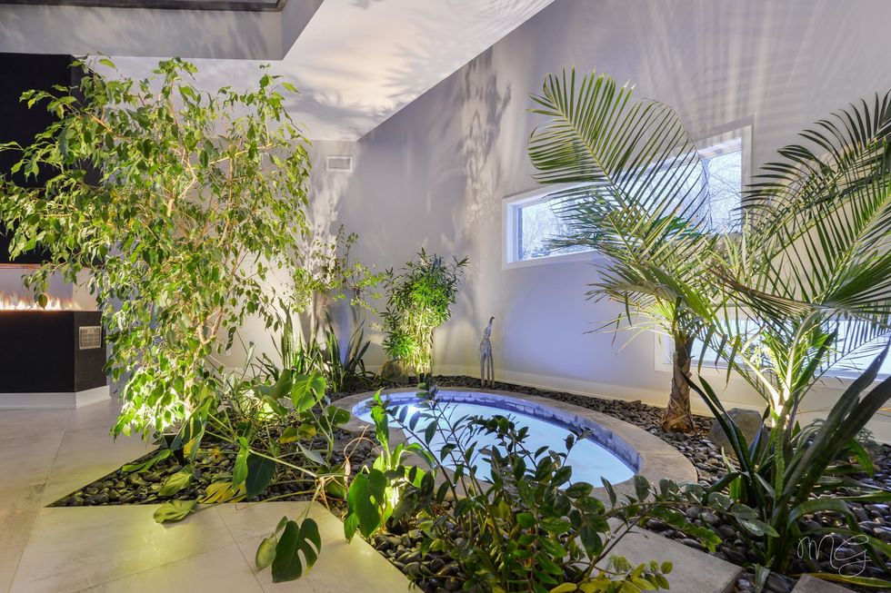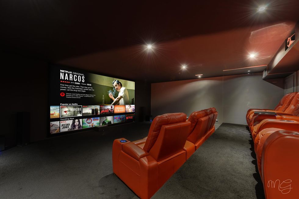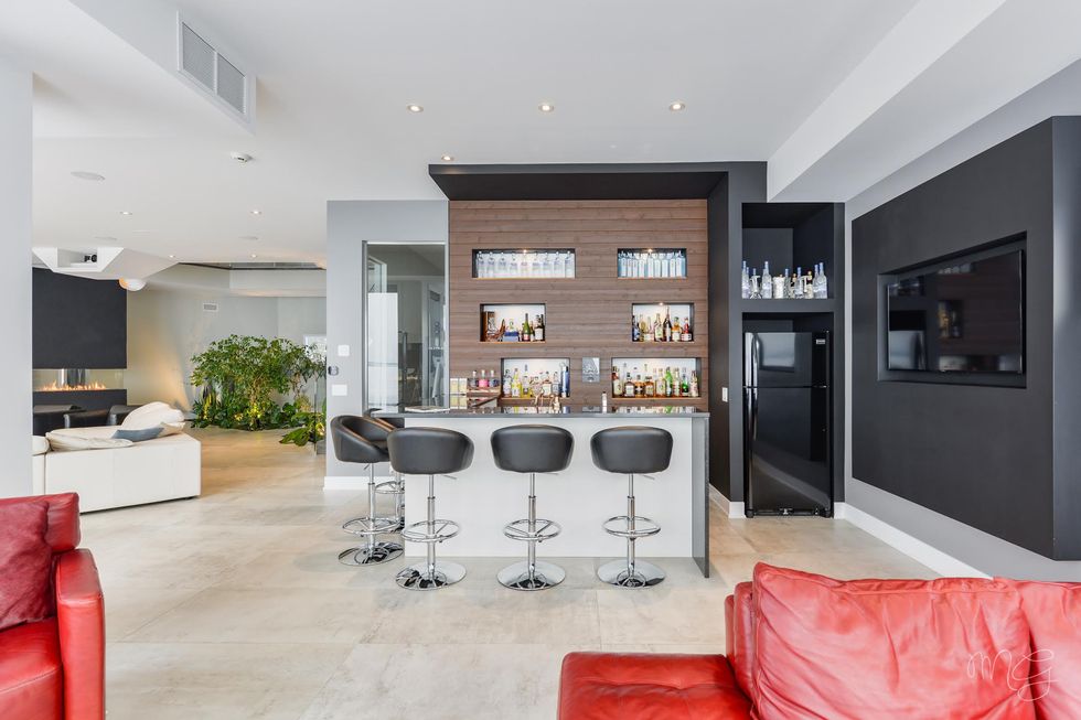 Sur le palier principal, ce sont les pièces communes qui occupent l'espace, soit la cuisine avec un îlot et la salle à manger au décor épuré dans une aire ouverte, puis le salon un peu en retrait à l'avant de la demeure, qui est habillé d'un tapis et de divans rouges.