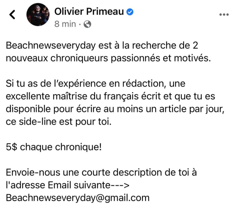 « Si tu as de l’expérience en rédaction, une excellente maîtrise du français et que tu es disponible pour écrire au moins un article par jour, ce side-line est pour toi. 5 $ chaque chronique ! » pouvait-on lire sur la publication diffusée sur la page Facebook d’Olivier Primeau.