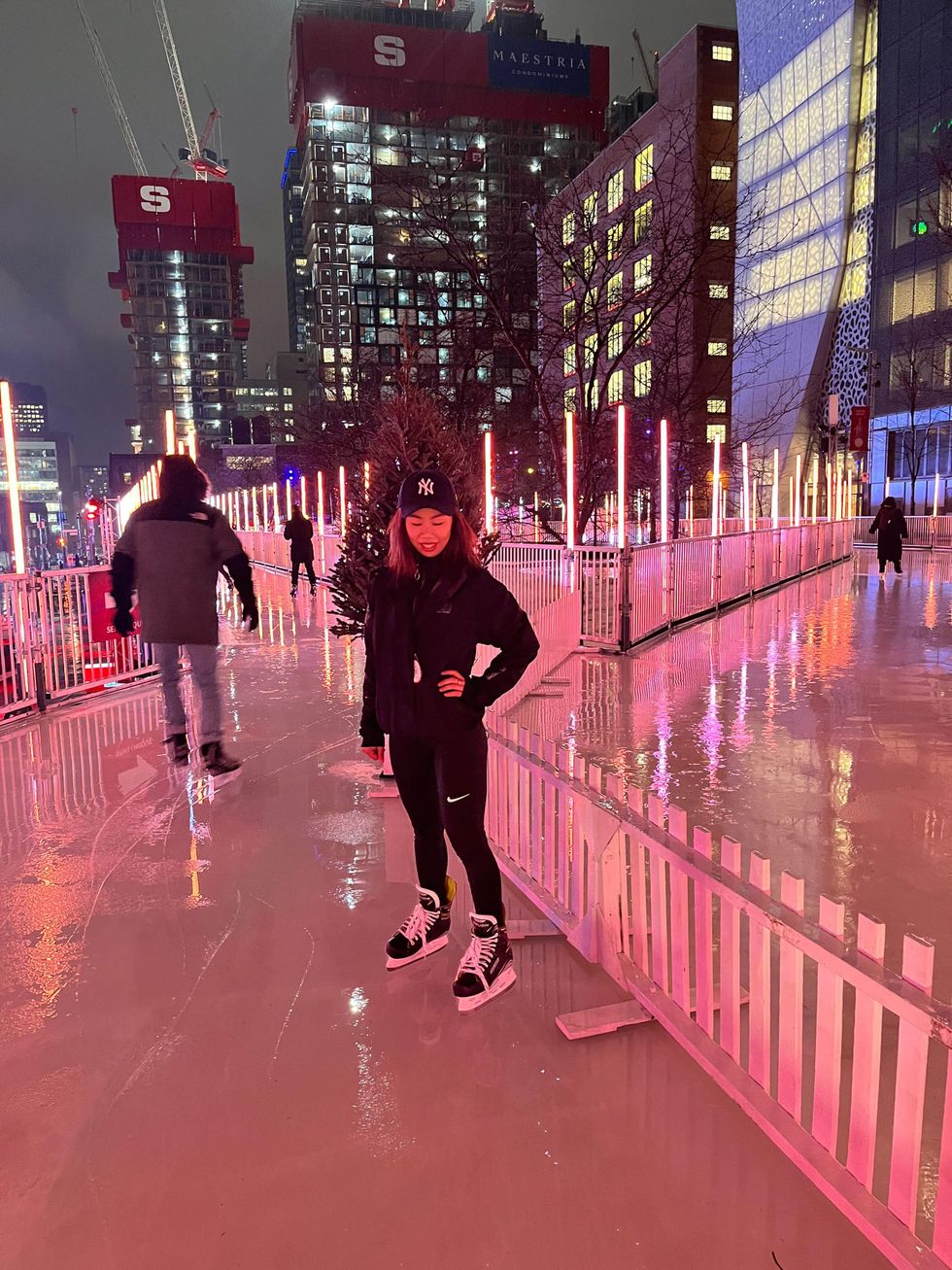 Tu peux t'y rendre gratuitement pour patiner et te laisser émerveiller par les jeux de lumière et les projections qui l'entourent.