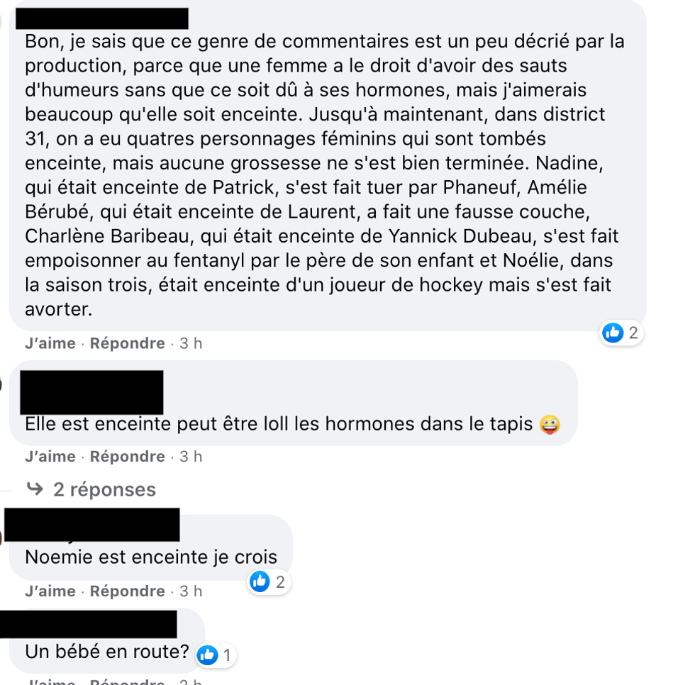 Depuis quelques semaines, une théorie persiste chez les fans de District 31 à propos de Noélie St-Hilaire, jouée par Catherine St-Laurent. Selon plusieurs, la sergente-détective, en couple avec son collègue Patrick Bissonnette, serait enceinte.