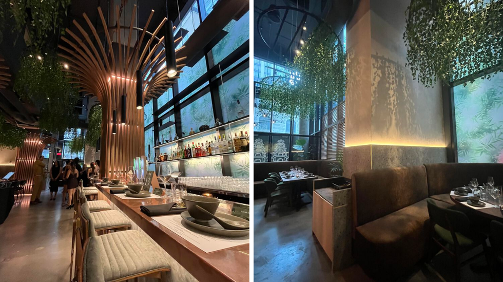 Dès notre entrée dans le restaurant, on est plongé dans un décor la fois moderne et industriel avec des touches de végétation, créant une ambiance à la fois chic et accueillante. Les plantes vertes qui sont partie intégrale du design ajoutent un élément de nature et de fraîcheur, contrastant avec les matériaux industriels comme le béton et la brique rouge. Puis, à ça on ajoute un mobilier et une section-bar noire et moderne, pour une ambiance élégante et feutrée lors du service au bar du menu omakase.