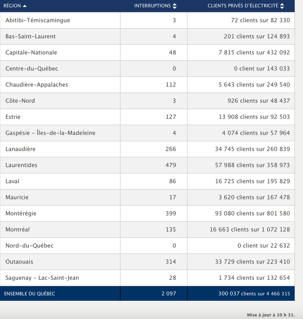 En effet, dans les Laurentides ce sont 98 412 client.es qui n'ont toujours pas d'électricité, dans les Laurentides iels sont 56 976 et 46 516 en Outaouais. Au total, il y a 1 482 pannes dans toute la province.