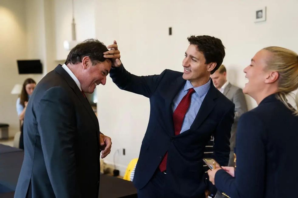 At an event in Toronto on October 12, 2022, Liberal MPs Arif Virani and Gianluca Cairo jokingly asked him to help them not look so short during a photo-op and so he got down on his knees.