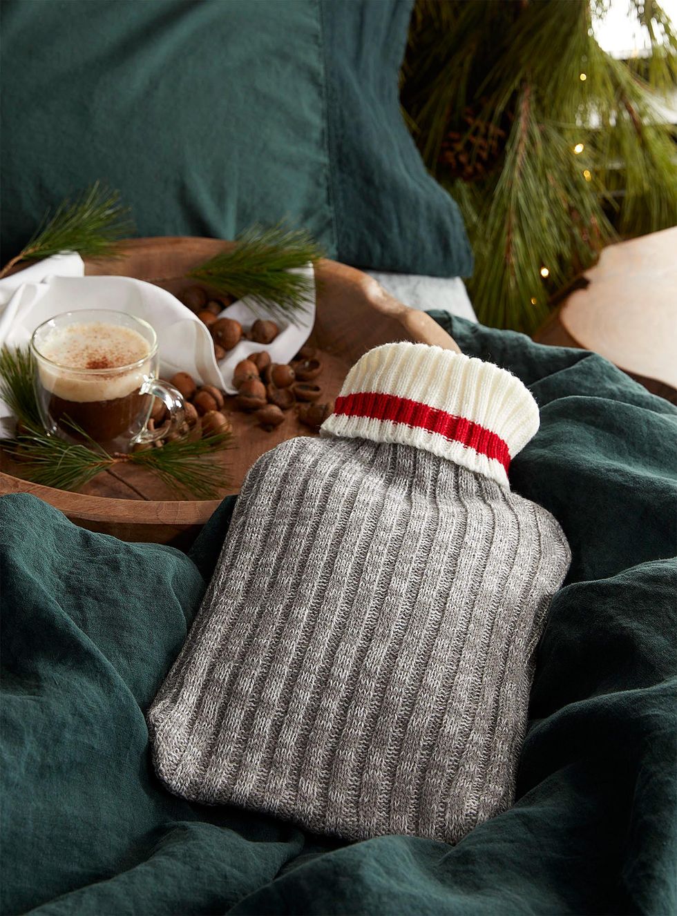 It's not necessarily bedding, but one way to stay warm in bed is to cuddle up with a hot water bottle. This one from Simons comes with a removable wool cover to keep you from burning. It's a total lifesaver for that time of the month, too.