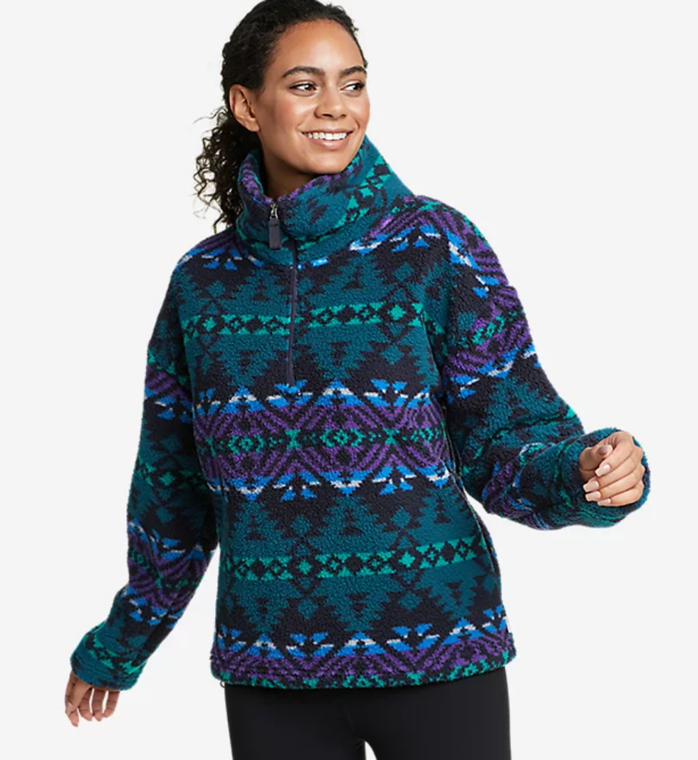 This funky-print fleece pullover is sure to keep you cozy on snowy winter days. It's available in three colours and in sizes XS to 2XL in petite, regular and plus.