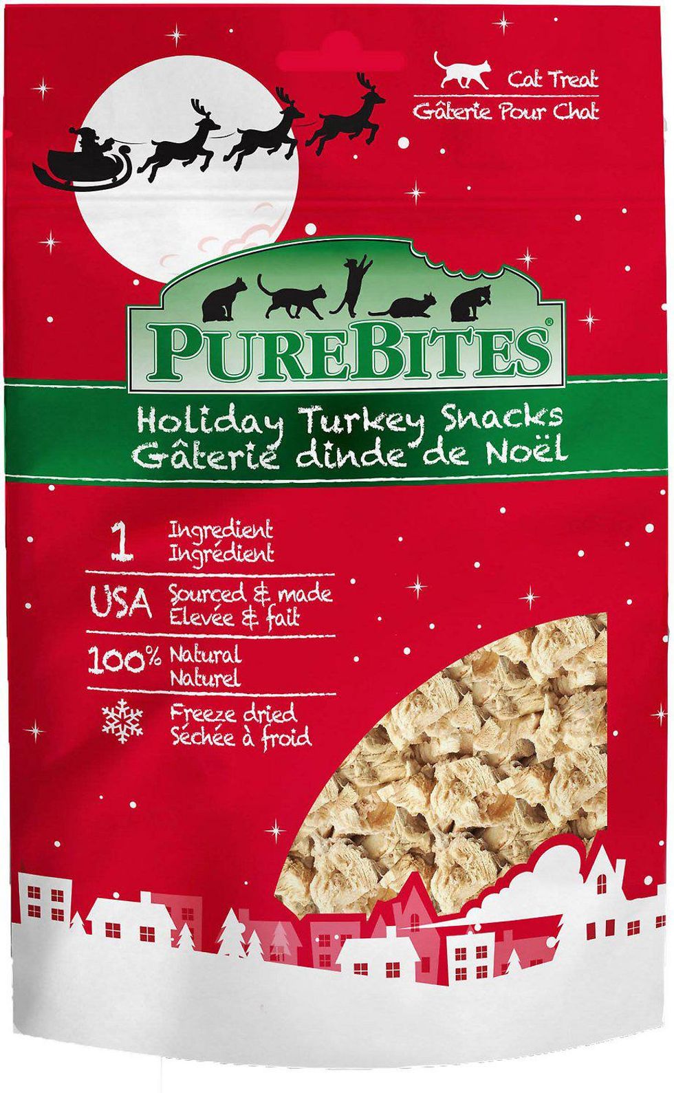 Details: Show your feline friend how special they are this holiday season with PureBites' Holiday Turkey Snacks. Made from 100% pure USA-sourced human-grade turkey, these irresistible treats are freeze-dried to preserve aroma and freshness.