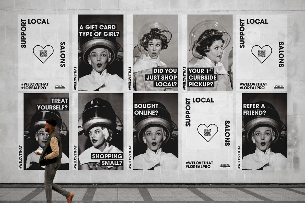 Across 15 GTA locations, you might see huge posting walls with fun visuals. Measuring 6 feet by 10 feet, these retro-themed L'Oréal Pro posters feature QR codes that you can scan to find nearby salons to support based on your geolocation.