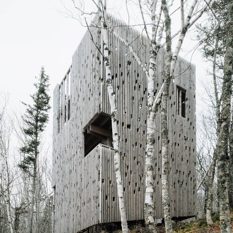 The Lookout at Broad Cove Marsh in Inverness, Cape Breton Island, was designed by Halifax-based architect Omar Gandhi and sits on a narrow piece of land between a tree-lined country road and a dramatic cliff that overlooks the ocean.
