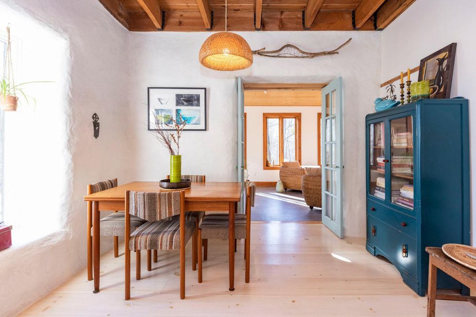 The house has three bedrooms and one bathroom, and the interior has "cozy" written all over it. Natural light pours in from the many windows, and a wood fireplace adds to the relaxed, homey feel.