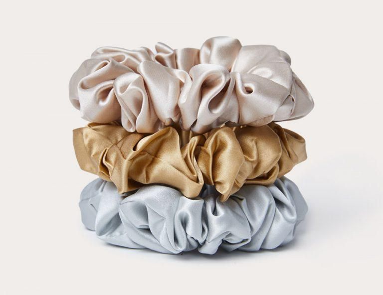 Details: Unlike other materials, silk scrunchies are much easier on hair that's prone to breakage. They're also less likely to leave behind a ponytail dent since the fabric is so smooth. This set comes in three colours: champagne, gold and silver.