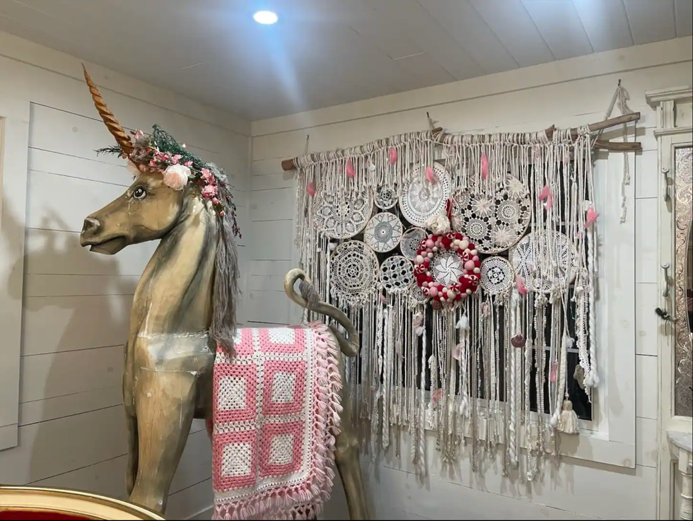 One of the most unique aspects is the life-sized, Instagrammable unicorn called Sunshine-Sugarboots Sparkle-Farts, and with a name like that, you just know it's going to be a memorable stay.