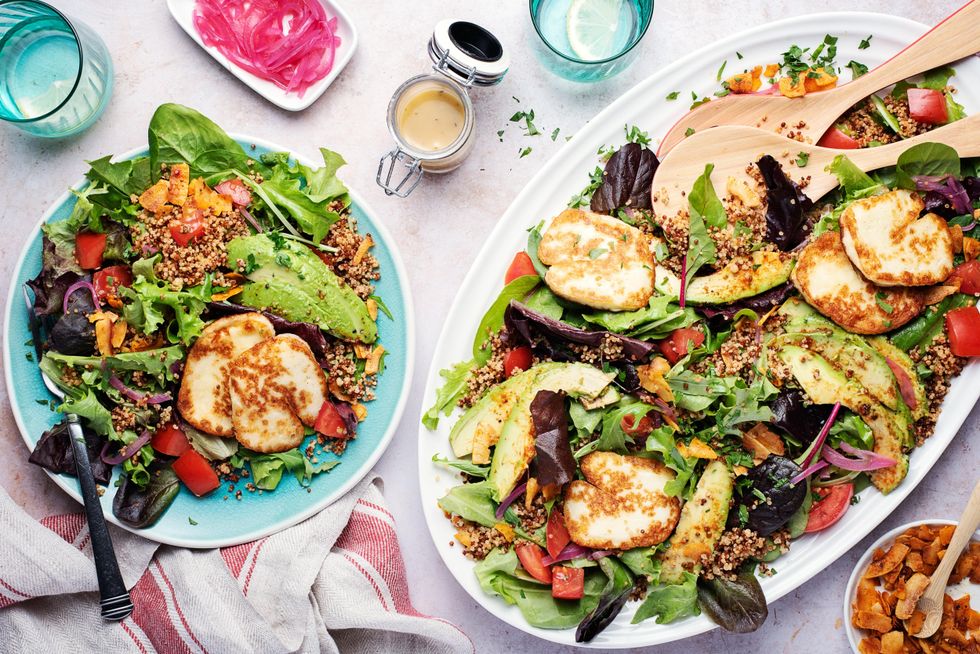 First up, a vegetarian-friendly Seared Halloumi & Smoky Coconut ‘Bacon’ Cobb Salad with avocados. Forget the Cobb salad you thought you knew that relied on chicken and bacon to get the job done. You can get a whole dose of healthy fats and smoky “bacon” goodness from plant-based sources. Combining paprika, turmeric, cayenne, and more, this sweet vinaigrette will have your taste buds dancing with fresh, zingy joy. Topped with seared halloumi and sliced avocado, this unique salad will have you asking “chicken, who?” Seriously, who knew that toasted coconut could taste so smoky and bacon-y?!