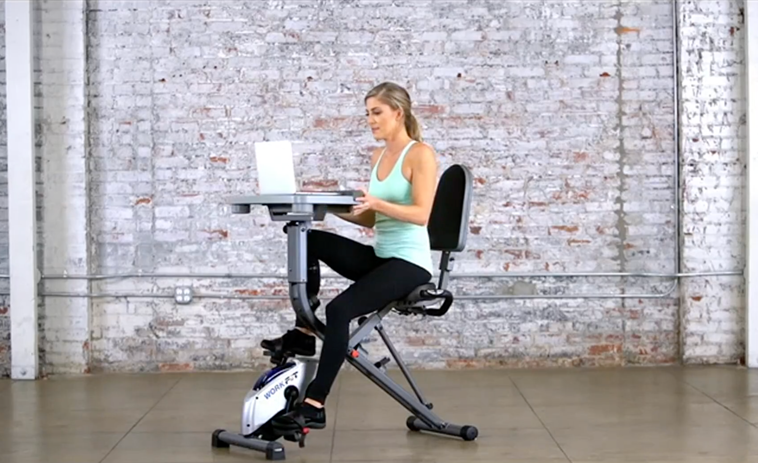The desk can slide far away enough that you can hop off the saddle and work in a standing position, too.
