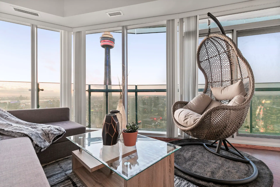 Why You Need To Go: You can enjoy breathtaking views of the CN Tower from a cozy swing chair in this stunning apartment.
